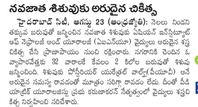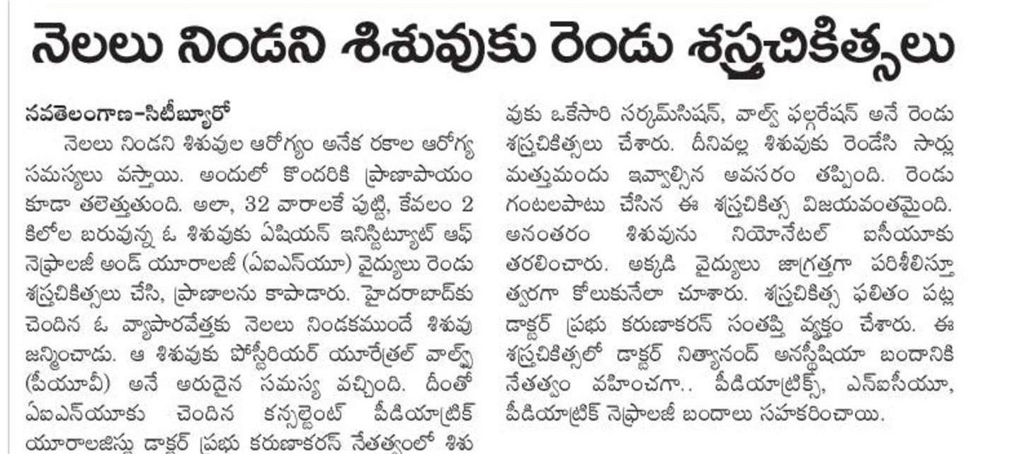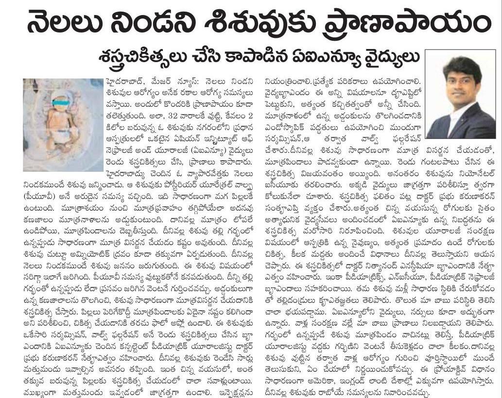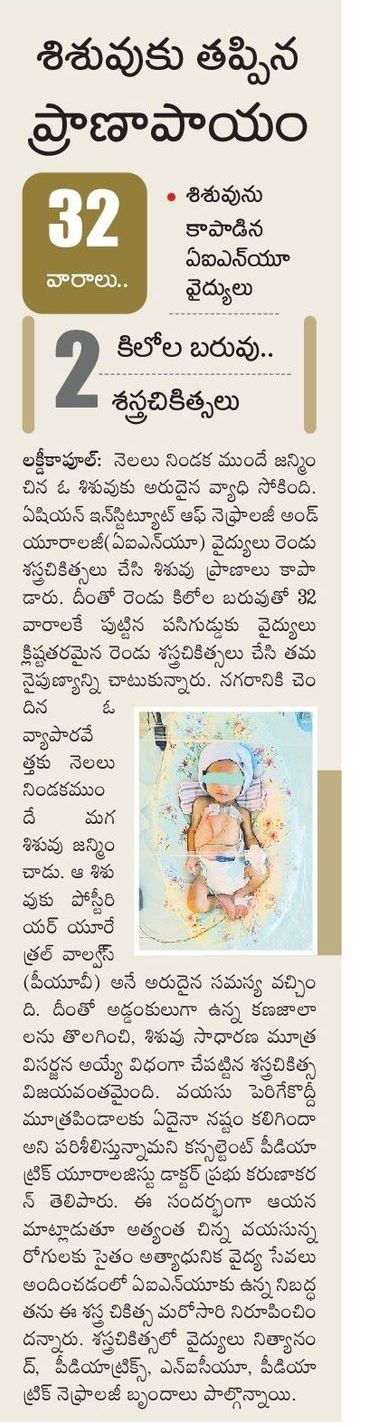 నెలలు నిండని శిశువుల ఆరోగ్యం అనేక రకాల ఆరోగ్య సమస్యలు వస్తాయి. అందులో కొందరికి ప్రాణాపాయం కూడా తలెత్తుతుంది. అలా, 32 వారాలకే పుట్టి, కేవలం 2 కిలోల బరువున్న ఓ శిశువుకు నగరంలోని ప్రధాన ఆస్పత్రులలో ఒకటైన ఏషియన్ ఇన్స్టిట్యూట్ ఆఫ్ నెఫ్రాలజీ అండ్ యూరాలజీ (ఏఐఎన్యూ) వైద్యులు రెండు శస్త్రచికిత్సలు చేసి, ప్రాణాలు కాపాడారు. హైదరాబాద్కు చెందిన ఓ వ్యాపారవేత్తకు నెలలు నిండకముందే శిశువు జన్మించాడు. ఆ శిశువుకు పోస్టీరియర్ యూరేత్రల్ వాల్వ్స్ (పీయూవీ) అనే అరుదైన సమస్య వచ్చింది. ఇది సాధారణంగా మగ పిల్లలకే ఉంటుంది. మూత్రాశయం నుంచి మూత్రప్రవాహం తగ్గిపోయేలా అదనపు కణజాలం మూత్రనాళాలను అడ్డుకుంటుంది. దానివల్ల మూత్రం లోపలే ఉండిపోయి, మూత్రపిండాలను దెబ్బతీస్తుంది. దీనివల్ల శిశువు తల్లి గర్భంలో ఉన్నప్పుడు సాధారణంగా మూత్ర విసర్జన చేయడం కష్టం అవుతుంది. దీనివల్ల శిశువు చుట్టూ అమ్నియోటిక్ ద్రవం కూడా తక్కువగా ఏర్పడుతుంది. దీనివల్ల నెలలు నిండకముందే శిశువు జననం జరుగుతుంది. ఈ శిశువు విషయంలో సరిగ్గా ఇలాగే జరిగింది. పీయూవీ సమస్య పుట్టుకతోనే కనపడుతుంది. దీన్ని తల్లి గర్భంతో ఉన్నప్పుడు లేదా ప్రసవం జరిగిన వెంటనే గుర్తించవచ్చు. అడ్డంకులుగా ఉన్న కణజాలాలను తొలగించి, శిశువు సాధారణంగా మూత్రవిసర్జన చేయదానికి శస్త్రచికిత్స చేస్తారు. పిల్లలు పెరిగేకొద్దీ మూత్రపిండాలకు ఏదైనా నష్టం కలిగిందా అని పరిశీలించి, చికిత్స చేయడానికి తరచు ఫాలో అప్లో ఉండాలి.