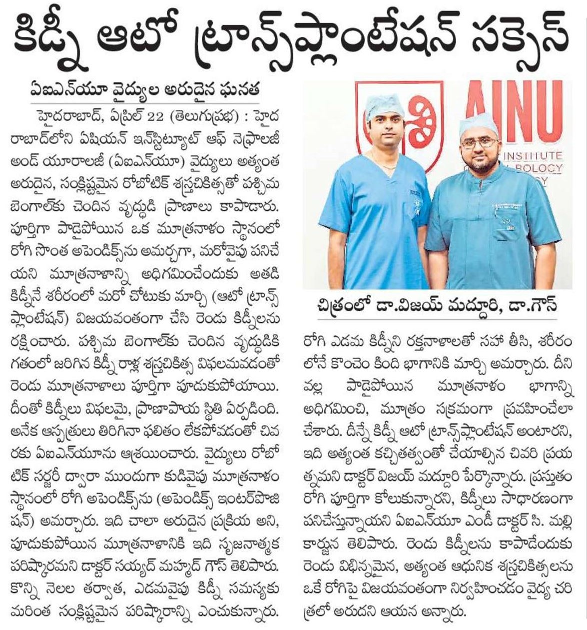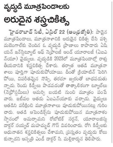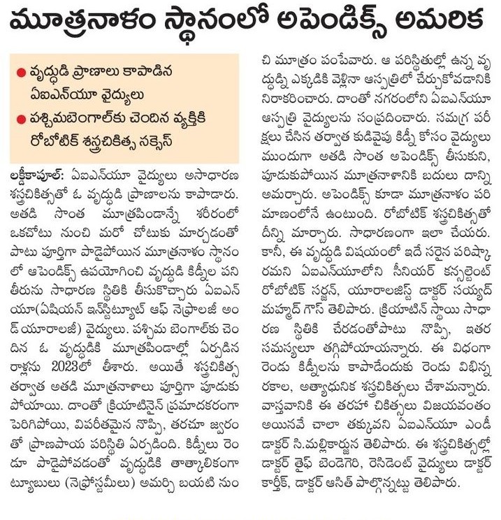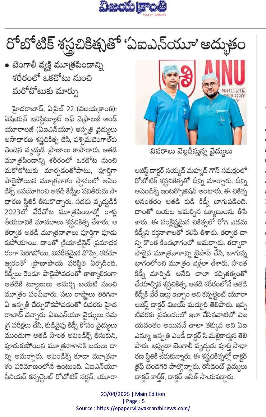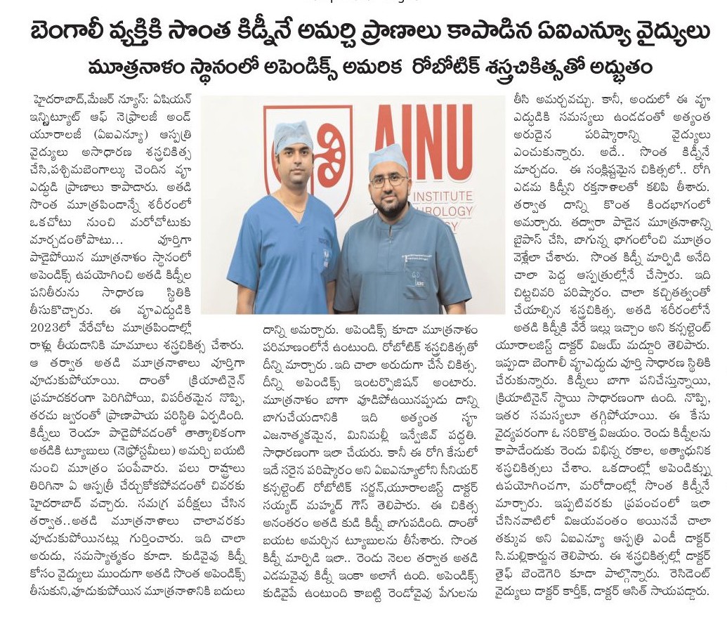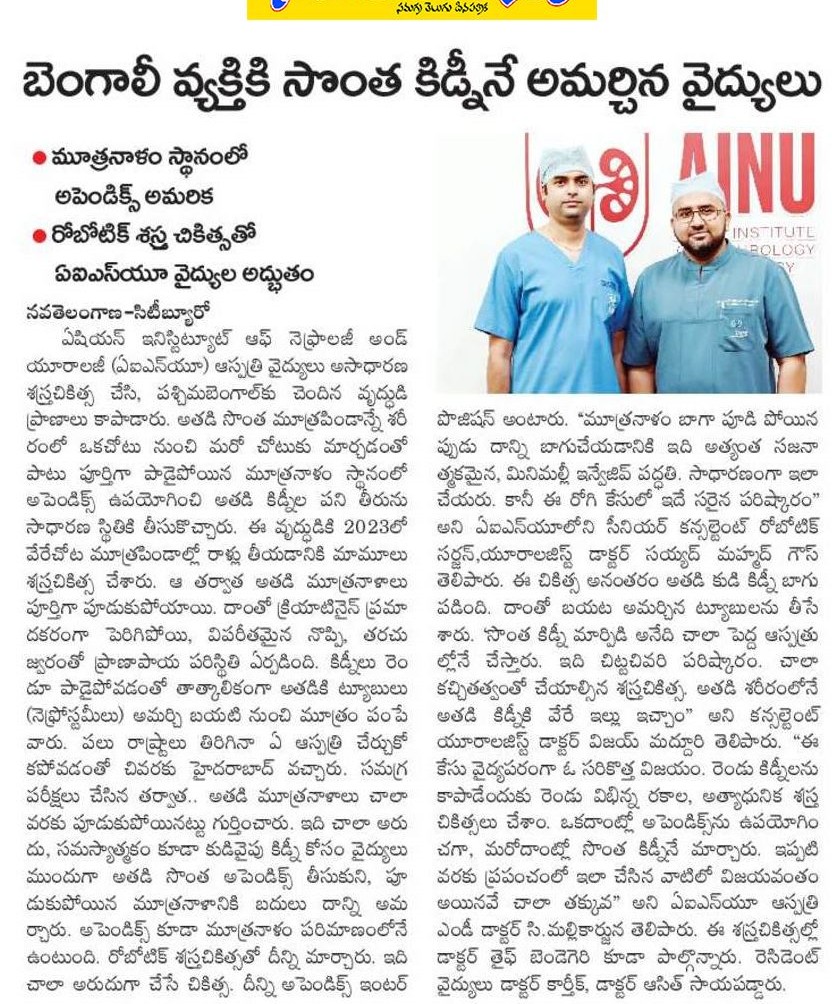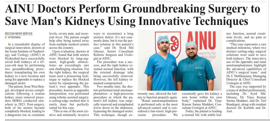 In a remarkable demonstration of surgical excellence and innovation, doctors at the Asian Institute of Nephrology and Urology (AINU) in Hyderabad successfully saved both kidneys of a 65-year-old man suffering from a rare and life-threatening condition—by transplanting one of his own kidneys to a new position in his body and using his appendix to replace a damaged ureter on the other side.
