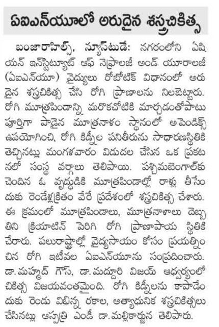 The team of doctor includes Dr. C. Mallikarjuna, Managing Director & Chief Consultant Urologist, Dr. Syed Md. Ghouse, Senior Consultant Robotic Surgeon and Urologist; Dr. Vijay Kumar Sarma Madduri, Consultant Urologist; Dr. Taif Bendegeri, Senior Consultant Urologist, and it was supported by resident doctors Dr. Karthik and Dr. Asit.