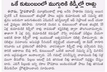 “ఆ కుటుంబంలో తండ్రికి, 13 ఏళ్ల వయసున్న పెద్ద కుమారుడికి గతంలో కిడ్నీలలో రాళ్లు తొలగించగా, 9 ఏళ్ల వయసున్న చిన్న కుమారుడికి కూడా ఇప్పుడు రాళ్లు ఏర్పడటంతో అత్యవసరంగా శస్త్రచికిత్స చేయాల్సి వచ్చింది. పైపెచ్చు, ఆ బాలుడికి ఎడమవైపు మూత్రపిండంలో ఒకటి, మూత్రనాళంలో మరొకటి రాళ్లు ఉన్నాయి. దాంతో తీవ్రమైన నొప్పి రావడంతో వెంటనే శస్త్రచికిత్స చేసి తొలగించాల్సి వచ్చింది. కుడివైపు కూడా అతడికి నొప్పి మొదలైంది. చూస్తే అక్కడ కూడా రాయి ఉంది. అయితే సాధారణంగా ఒకేసారి రెండువైపులా కిడ్నీలో రాళ్లు తొలగించం. అందువల్ల దానికి మరోసారి చేయాల్సి ఉంటుంది. దీన్ని వారసత్వం అని చెప్పలేము గానీ, కుటుంబంలో ఎవరికైనా ఈ సమస్య ఉంటే మాత్రం కొంచెం అప్రమత్తం కావడం మంచిది” అని చెప్పారు.