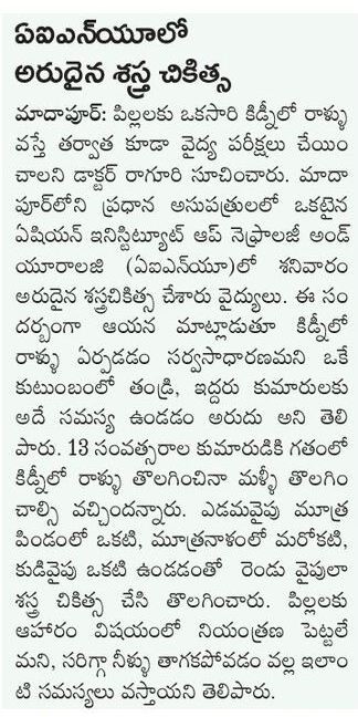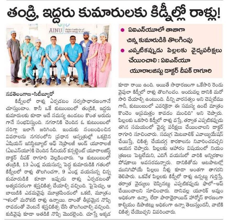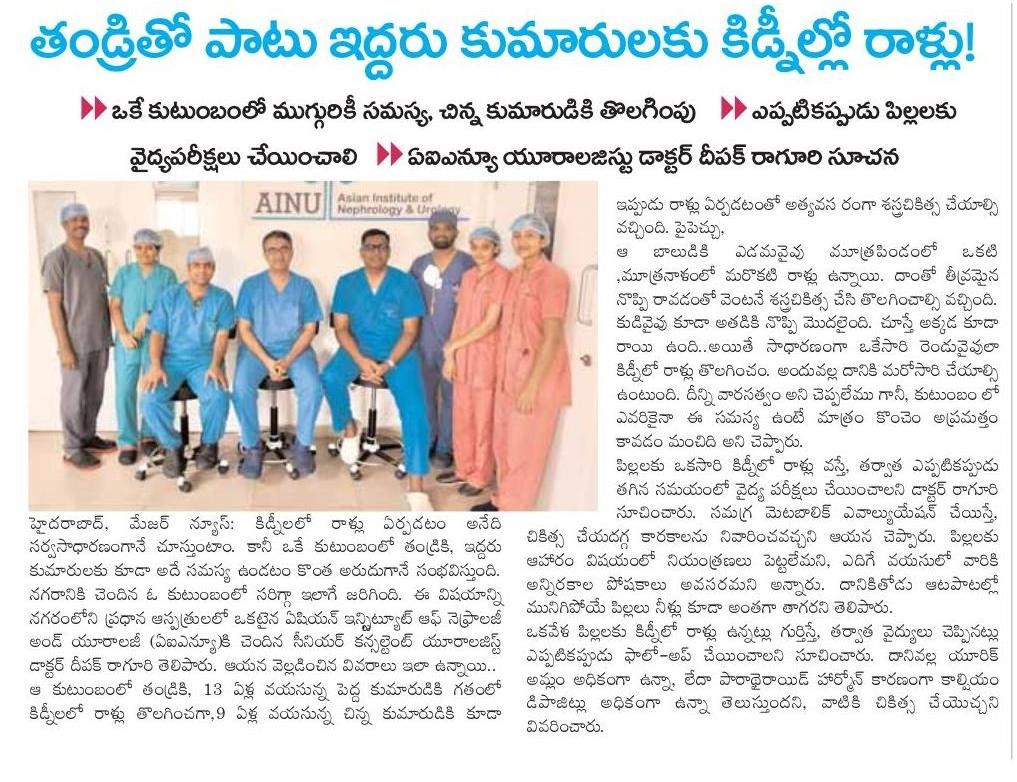 కిడ్నీలలో రాళ్లు ఏర్పడటం అనేది సర్వసాధారణంగానే చూస్తుంటాం. కానీ ఒకే కుటుంబంలో తండ్రికి, ఇద్దరు కుమారులకు కూడా అదే సమస్య ఉండటం కొంత అరుదుగానే సంభవిస్తుంది. నగరానికి చెందిన ఓ కుటుంబంలో సరిగ్గా ఇలాగే జరిగింది. ఈ విషయాన్ని నగరంలోని ప్రధాన ఆస్పత్రులలో ఒకటైన ఏషియన్ ఇన్స్టిట్యూట్ ఆఫ్ నెఫ్రాలజీ అండ్ యూరాలజీ (ఏఐఎన్యూ)కి చెందిన సీనియర్ కన్సల్టెంట్ యూరాలజిస్ట్ డాక్టర్ దీపక్ రాగూరి తెలిపారు. ఆయన వెల్లడించిన వివరాలు ఇలా ఉన్నాయి..