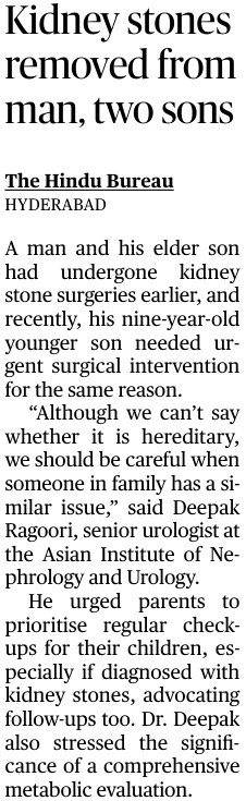 Hyderabad, 27th April 2024: Kidney stones are a common problem, but it's rare to see a father and his two sons suffering from the same issue. A family in Hyderabad experienced this, and Dr. Deepak Ragoori, Senior Consultant Urologist of the Asian Institute of Nephrology and Urology (AINU), explained their case. The father and elder son had been operated on previously, while the younger son of nine years recently developed kidney stones and needed emergency surgery. Although we can't say it's inheritance, it's essential to be cautious when anyone in the family has a similar issue.