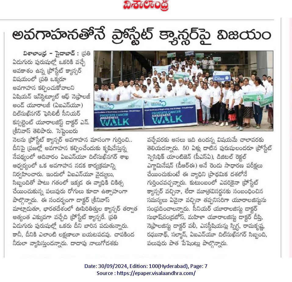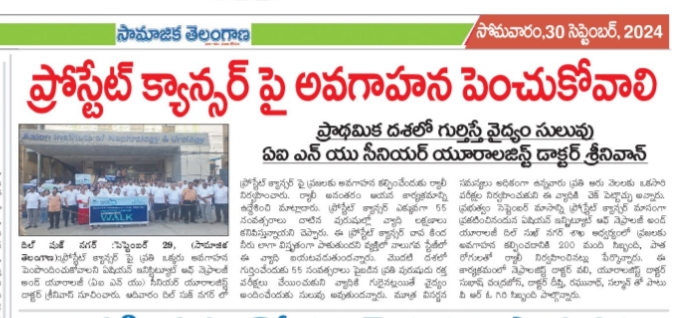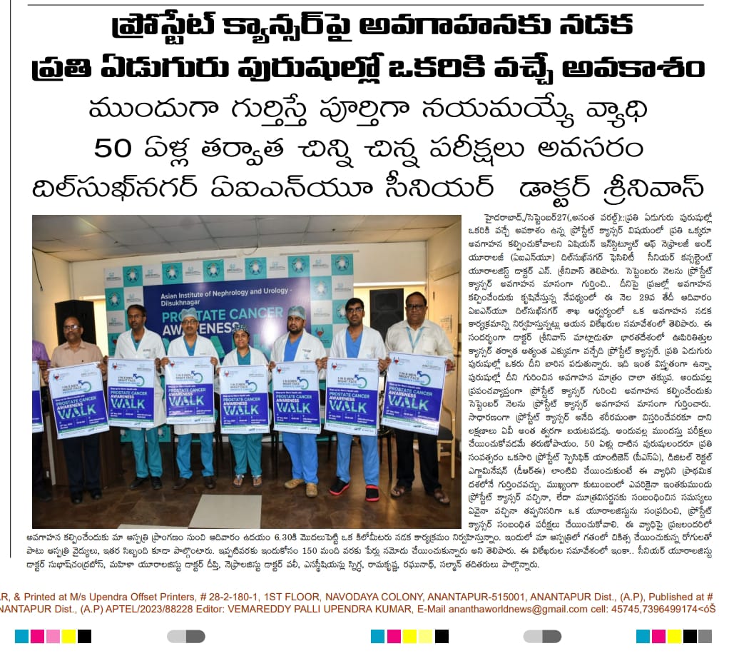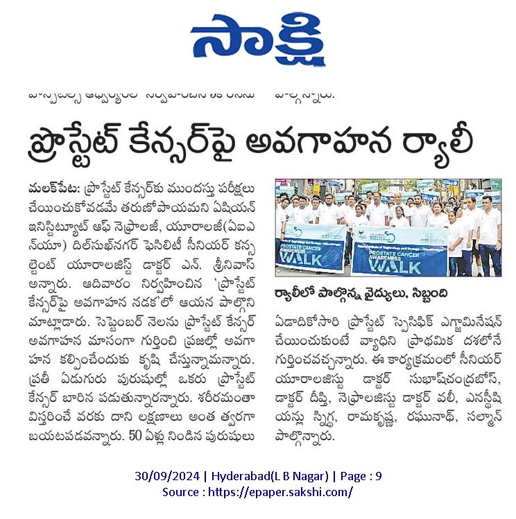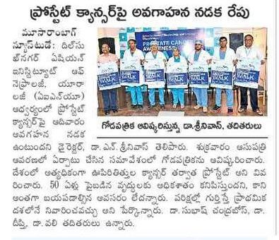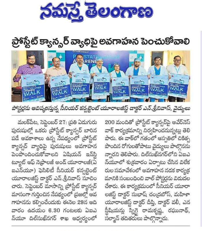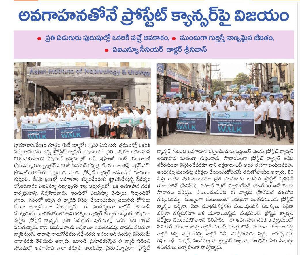 ప్రతి ఏడుగురు పురుషుల్లో ఒకరికి వచ్చే అవకాశం ఉన్న ప్రోస్టేట్ క్యాన్సర్ విషయంలో ప్రతి ఒక్కరూ అవగాహన కల్పించుకోవాలని ఏషియన్ ఇన్స్టిట్యూట్ ఆఫ్ నెఫ్రాలజీ అండ్ యూరాలజీ (ఏఐఎన్యూ) దిల్సుఖ్నగర్ ఫెసిలిటీ సీనియర్ కన్సల్టెంట్ యూరాలజిస్ట్ డాక్టర్ ఎన్. శ్రీనివాస్ తెలిపారు. సెప్టెంబరు నెలను ప్రోస్టేట్ క్యాన్సర్ అవగాహన మాసంగా గుర్తించి.. దీనిపై ప్రజల్లో అవగాహన కల్పించేందుకు కృషిచేస్తున్న నేపథ్యంలో ఆదివారం ఏఐఎన్యూ దిల్సుఖ్నగర్ శాఖ ఆధ్వర్యంలో ఒక అవగాహన నడక కార్యక్రమాన్ని నిర్వహించారు. ఇందులో ఏఐఎన్యూ వైద్యులు, సిబ్బందితో పాటు.. గతంలో ఇక్కడ ఈ వ్యాధికి చికిత్స చేయించుకున్న పలువురు రోగులు కూడా ఉత్సాహంగా పాల్గొన్నారు.