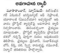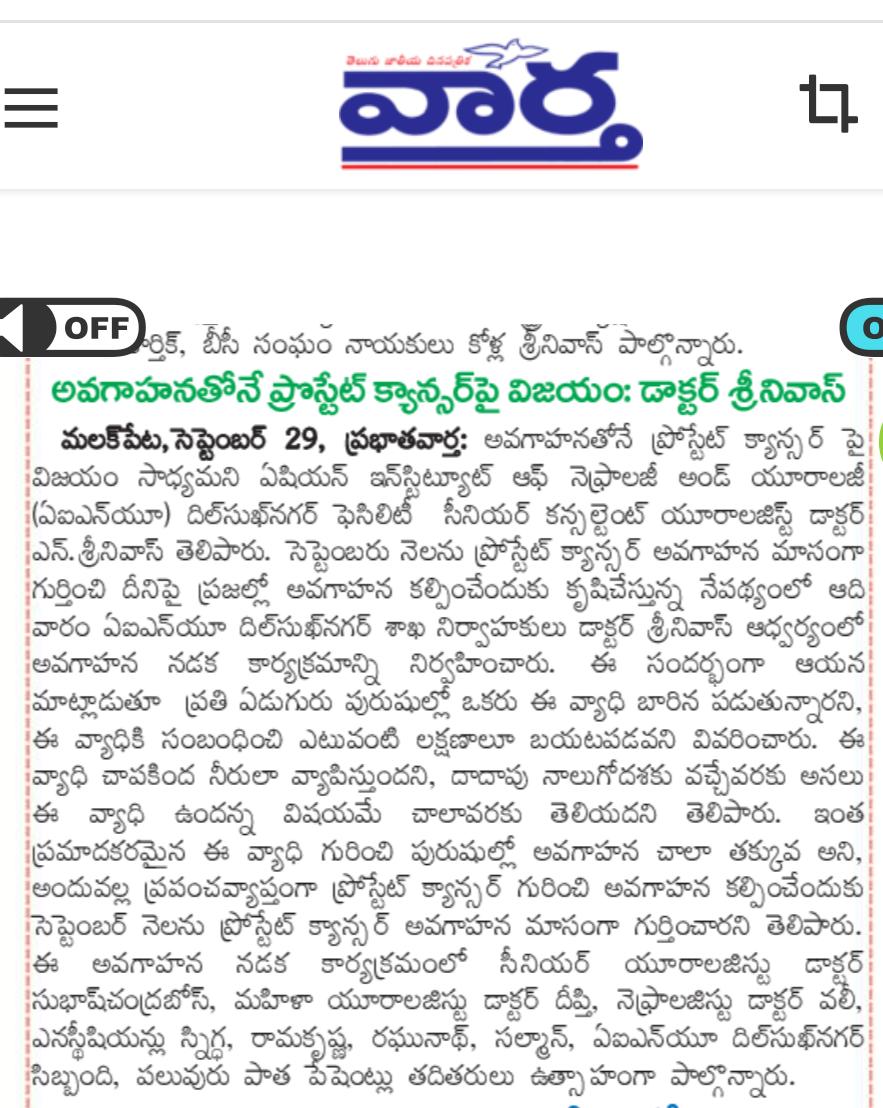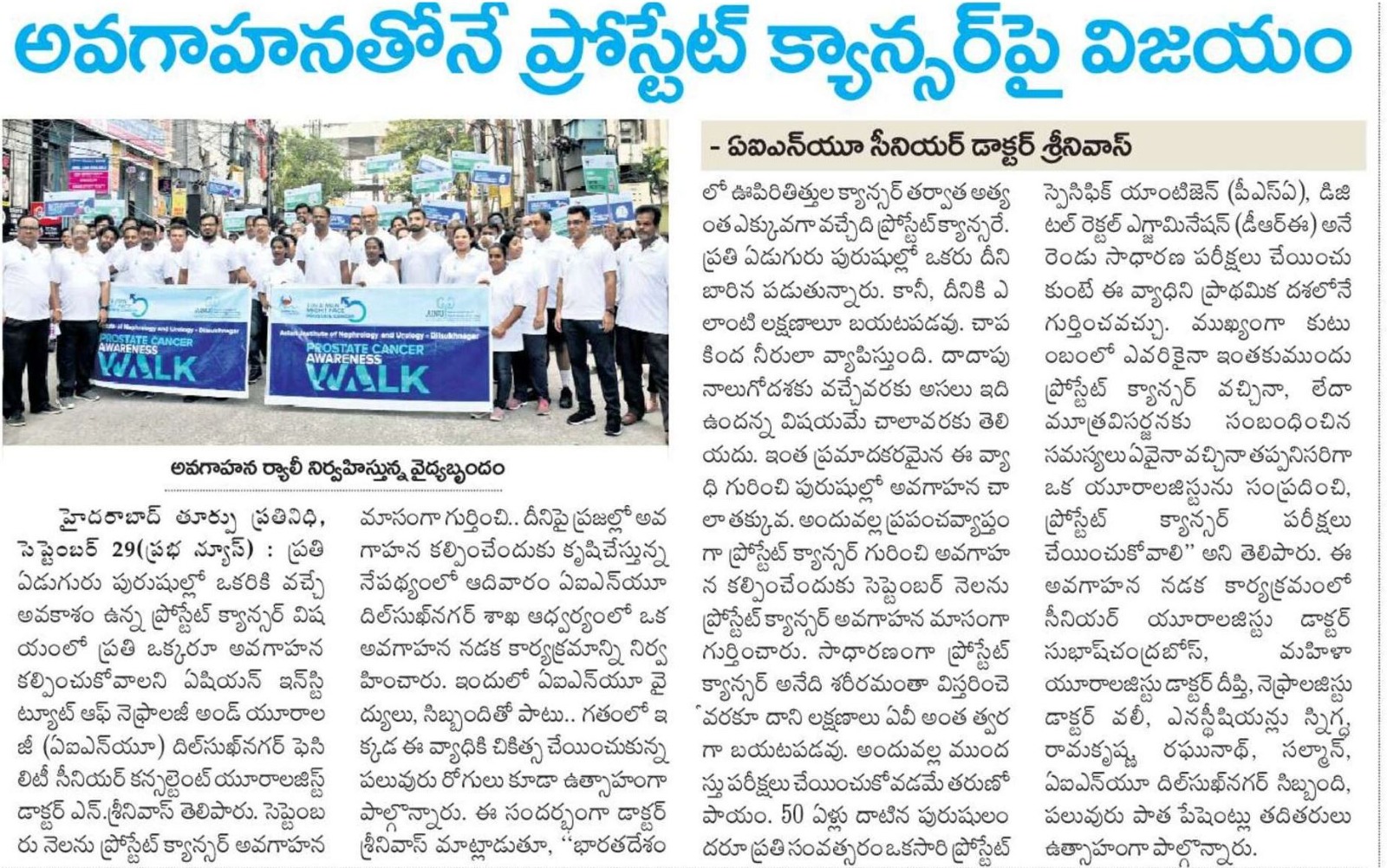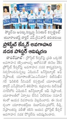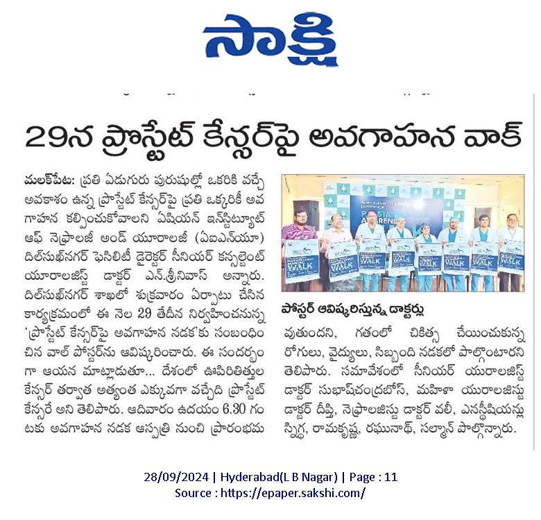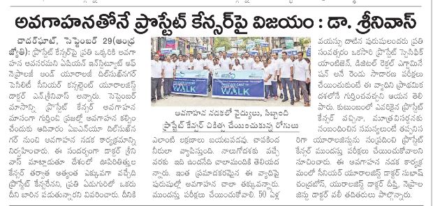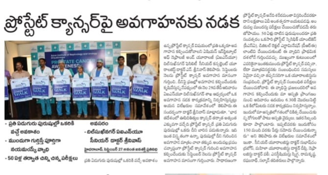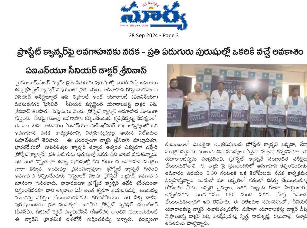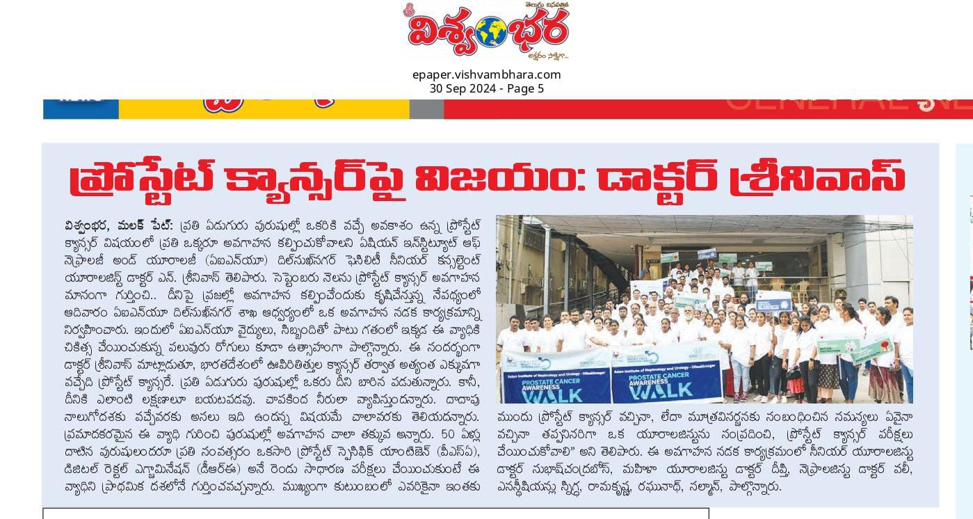 ప్రతి ఏడుగురు పురుషుల్లో ఒకరికి వచ్చే అవకాశం ఉన్న ప్రోస్టేట్ క్యాన్సర్ విషయంలో ప్రతి ఒక్కరూ అవగాహన కల్పించుకోవాలని ఏషియన్ ఇన్స్టిట్యూట్ ఆఫ్ నెఫ్రాలజీ అండ్ యూరాలజీ (ఏఐఎన్యూ) దిల్సుఖ్నగర్ ఫెసిలిటీ సీనియర్ కన్సల్టెంట్ యూరాలజిస్ట్ డాక్టర్ ఎన్. శ్రీనివాస్ తెలిపారు. సెప్టెంబరు నెలను ప్రోస్టేట్ క్యాన్సర్ అవగాహన మాసంగా గుర్తించి.. దీనిపై ప్రజల్లో అవగాహన కల్పించేందుకు కృషిచేస్తున్న నేపథ్యంలో ఆదివారం ఏఐఎన్యూ దిల్సుఖ్నగర్ శాఖ ఆధ్వర్యంలో ఒక అవగాహన నడక కార్యక్రమాన్ని నిర్వహించారు. ఇందులో ఏఐఎన్యూ వైద్యులు, సిబ్బందితో పాటు.. గతంలో ఇక్కడ ఈ వ్యాధికి చికిత్స చేయించుకున్న పలువురు రోగులు కూడా ఉత్సాహంగా పాల్గొన్నారు.